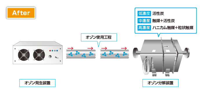| オゾンが低濃度であれば活性炭、中程度であれば触媒+活性炭、高濃度はハニカム触媒と粒状触媒を用いた構成にすることで効率的な分解が可能になります。 |